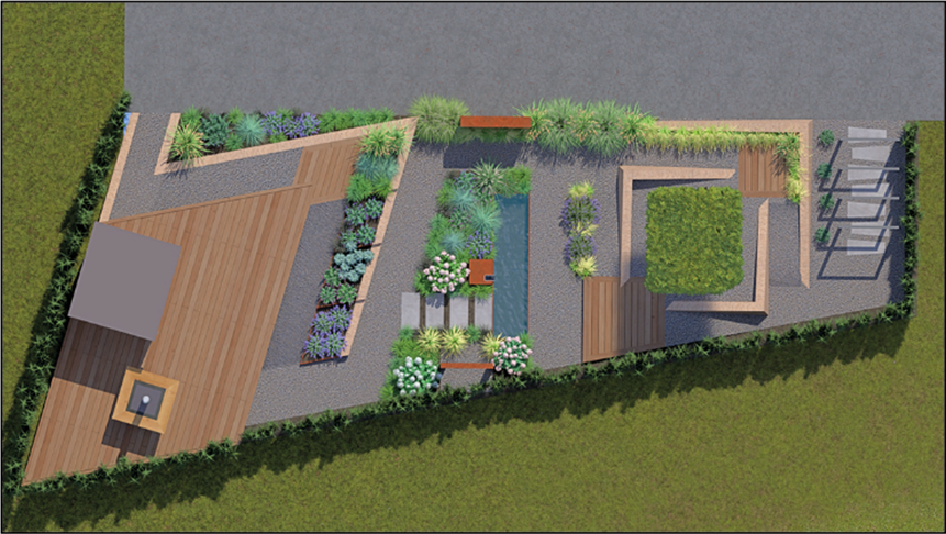 Im Garten der Firmen Steinbrück Blumen-Gärten-Grün aus Schwäbisch Gmünd, Gebrüder Hupfeld aus Aalen und Naturraum Gartenbau aus Königsbronn verschmelzen die Elemente Wasser, Feuer, Luft und Erde zu einem harmonischen Rückzugsort, frei vom Alltagsstress. Bienenfreundliche Stauden, Geophyten und sorgsam ausgewählte Gehölze garantieren ganzjährige Blütenpracht und fördern die Artenvielfalt. In den Hochbeeten gedeihen Gemüse und Naschobst zum Eigenverzehr. Recycelte Betonsteine und Upcycling-Elemente bekommen ein zweites Leben. Stahlbecken, Holzterrassen und schlichter Ortbeton setzen interessante räumliche Akzente und harmonieren mit dem Belag aus heimischen Schüttgütern. Die Grillstelle lädt zum Feierabendgenuss vor die Holzhütte ein, die dank Photovoltaikanlage das Autarkiekonzept vervollständigt.